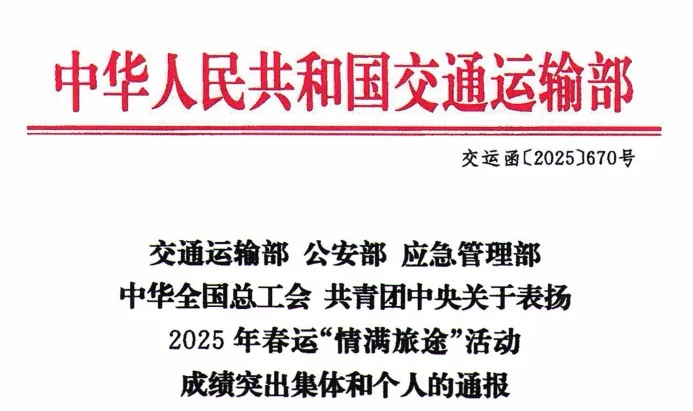 近日,交通运输部、公安部、应急管理部、中华全国总工会、共青团中央联合发文,对在2025年春运“情满旅途”活动中涌现出的成绩突出集体和个人予以通报表扬。河北高速集团石安分公司石家庄南收费站光荣上榜,获评“成绩突出集体”,成为我省交通运输服务窗口的优秀代表之一。