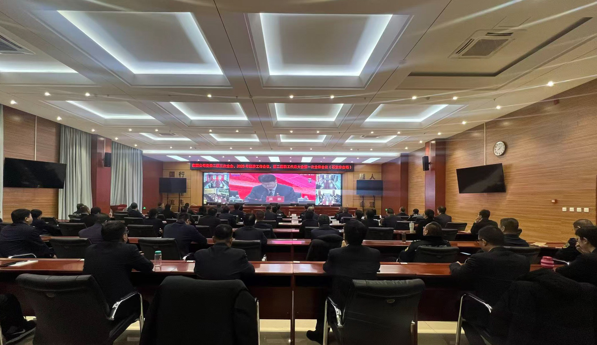 12月27日,集团公司组织召开党委二届三次全会、2026 年经济工作会议、第二届职工代表大会第一次全体会议,石安分公司领导班子成员,所属各单位、总部各部室主要负责人、负责人及职工代表在分会场参加。