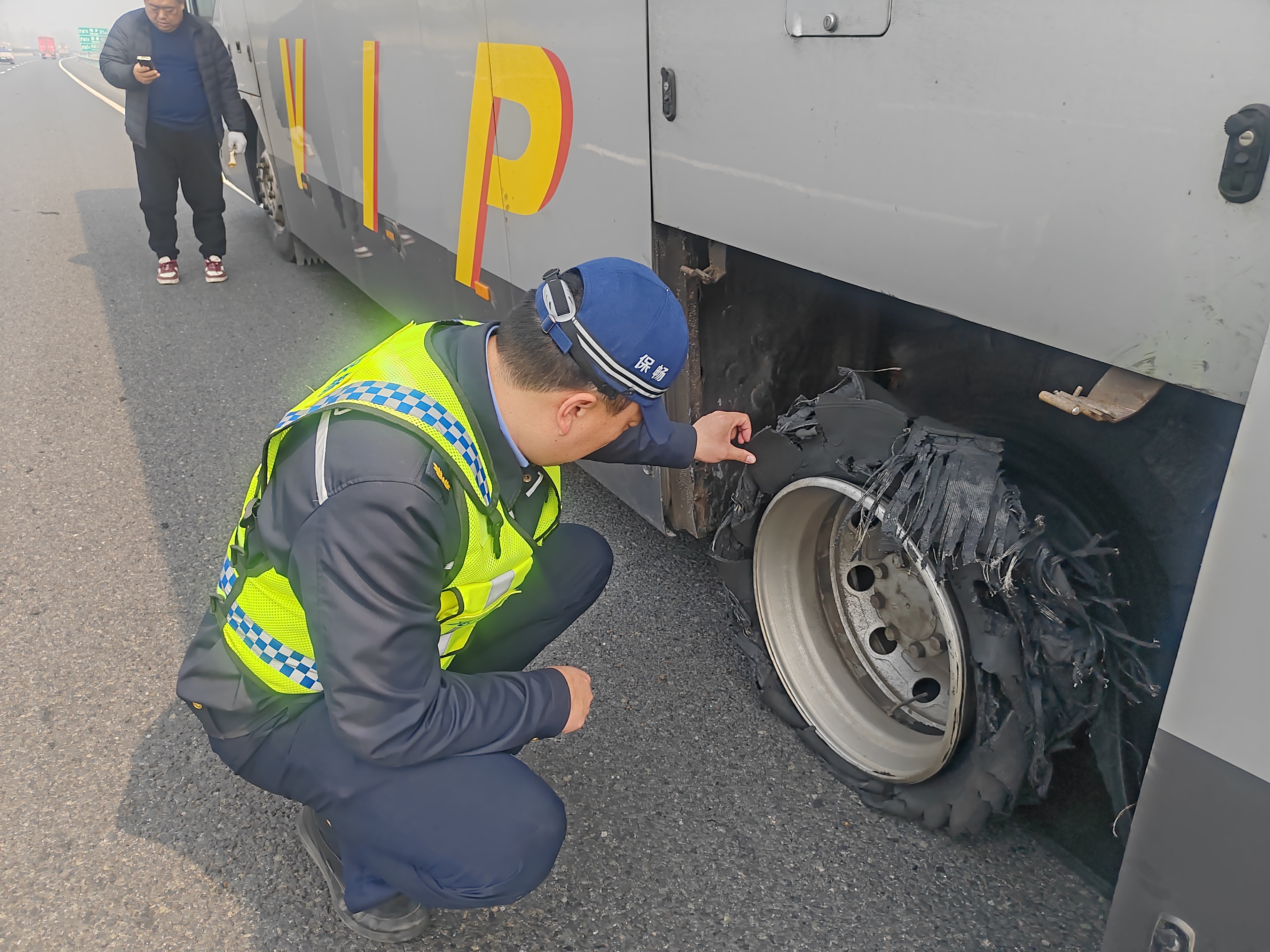 当日,大队在日常巡查中发现,一辆载有50余名学生的大巴车因突发爆胎,被迫停靠在行车道与应急车道之间,占据部分行车道,存在极大安全隐患。大队随即启动应急预案,并联合高速交警迅速开展管控与救援工作。